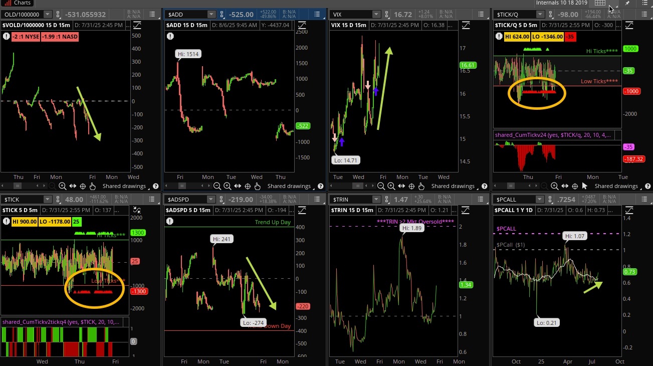If we look at the VOLD it shows us weakness everyday. this is the volume adjusted up/down indicator, no wonder we have a cluster of distribution day. This is clearly bearish, and the ADD is showing the same weakness. Put/calls remain elevated, VIX is starting to get ‘jiggy’, too. TICKS were mostly red all day, a sign of sell programs hitting hard.
