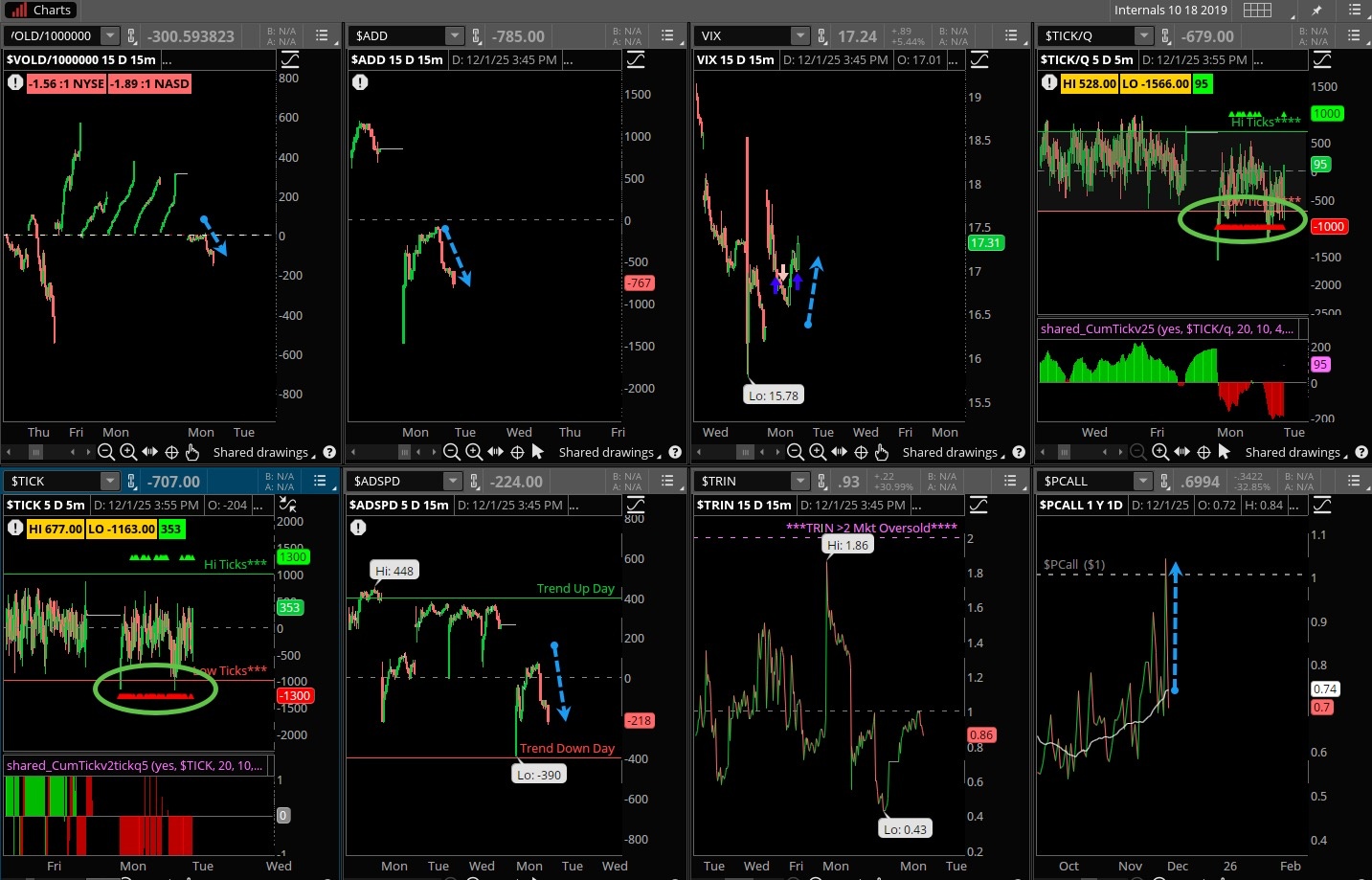 A miserable. day for the internals, VOLD was weak as was ADD, no relief all day long. Put/calls, which rose up on Friday came down a bit but are still elevated. Ticks were solid red on Monday, the VIX was up a bit but finished off highs of the day. ADSPD was weak and nearly a trend down day. Looking for a turnaround Tuesday.