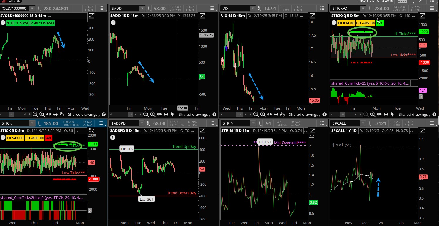 We really had poor to average internals on Friday, the VOLD got slammed late as did the ADD, which barely finished positive. Notice the put/call and ADSPD, both showing some concern, but the VIX did not, falling hard as the markets rallied. Ticks were mostly strong early but faded late.