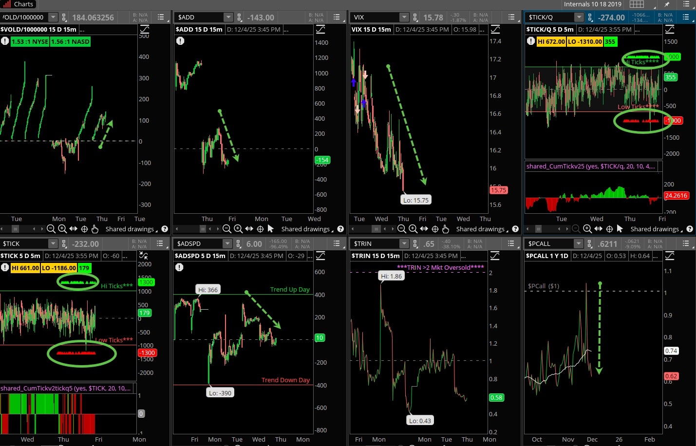 After yesterday’s strong internals it would have been difficult for the bulls to pull off another big win, so we ended up with a mixed picture. That’s fine, perhaps we’ll get more action here today. VOLD was strong but not like yesterday, VIX was active but ended down by the close, ADD and ADSPD right near the flat line. Pretty well even on the ticks, buy and sell programs equal on the NASDAQ. Put/calls took a dive and is now below a key .65 level.
