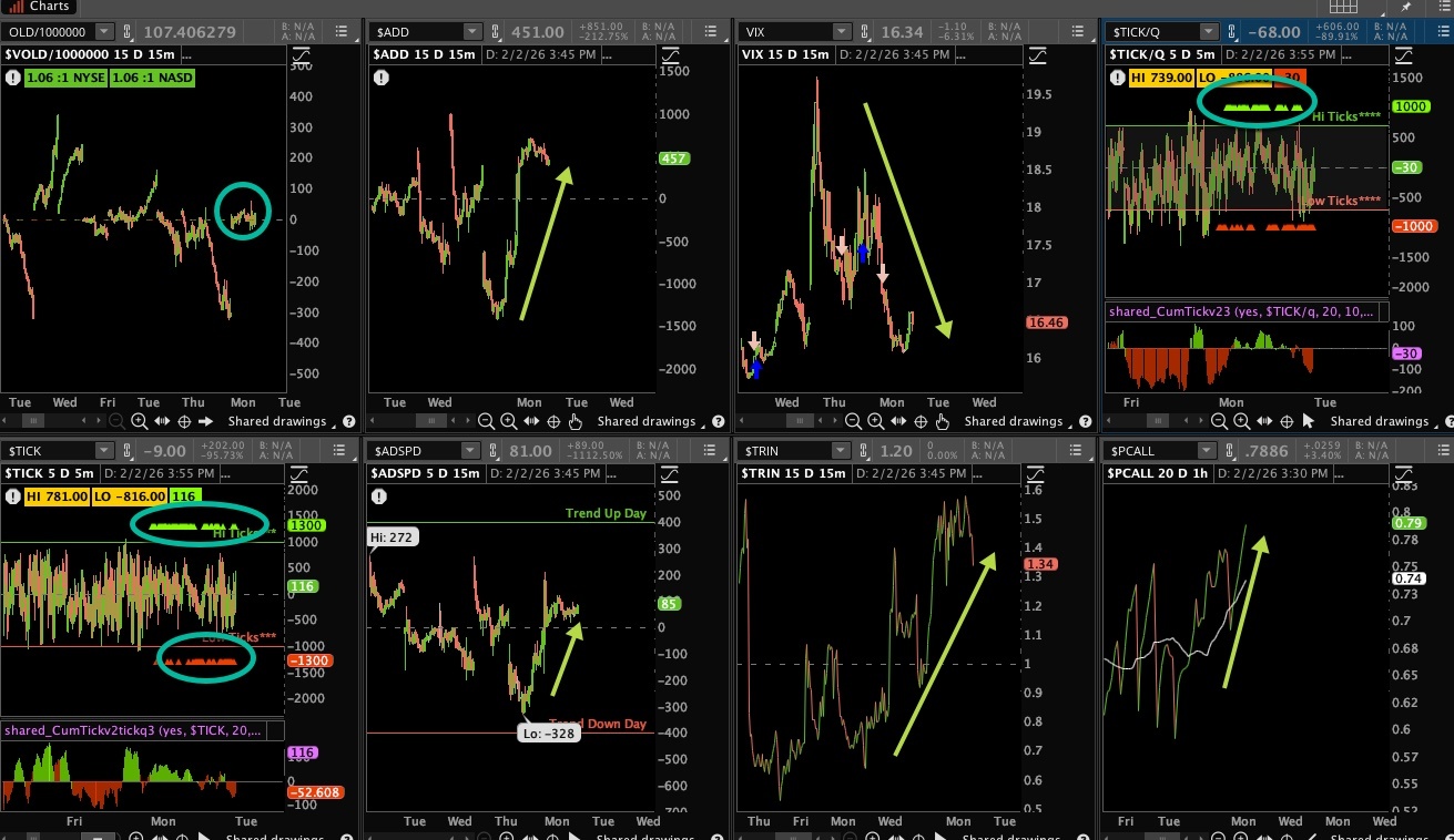 I’m going to call the internals mediocre for Monday. They just were not impressive given the strong move in the indices, but that could turn around today. Ticks were strong, the VOLD and ADD barely positive, but the VIX did come off its highs of the session. Put/call continues to rise, traders are buying protection here.