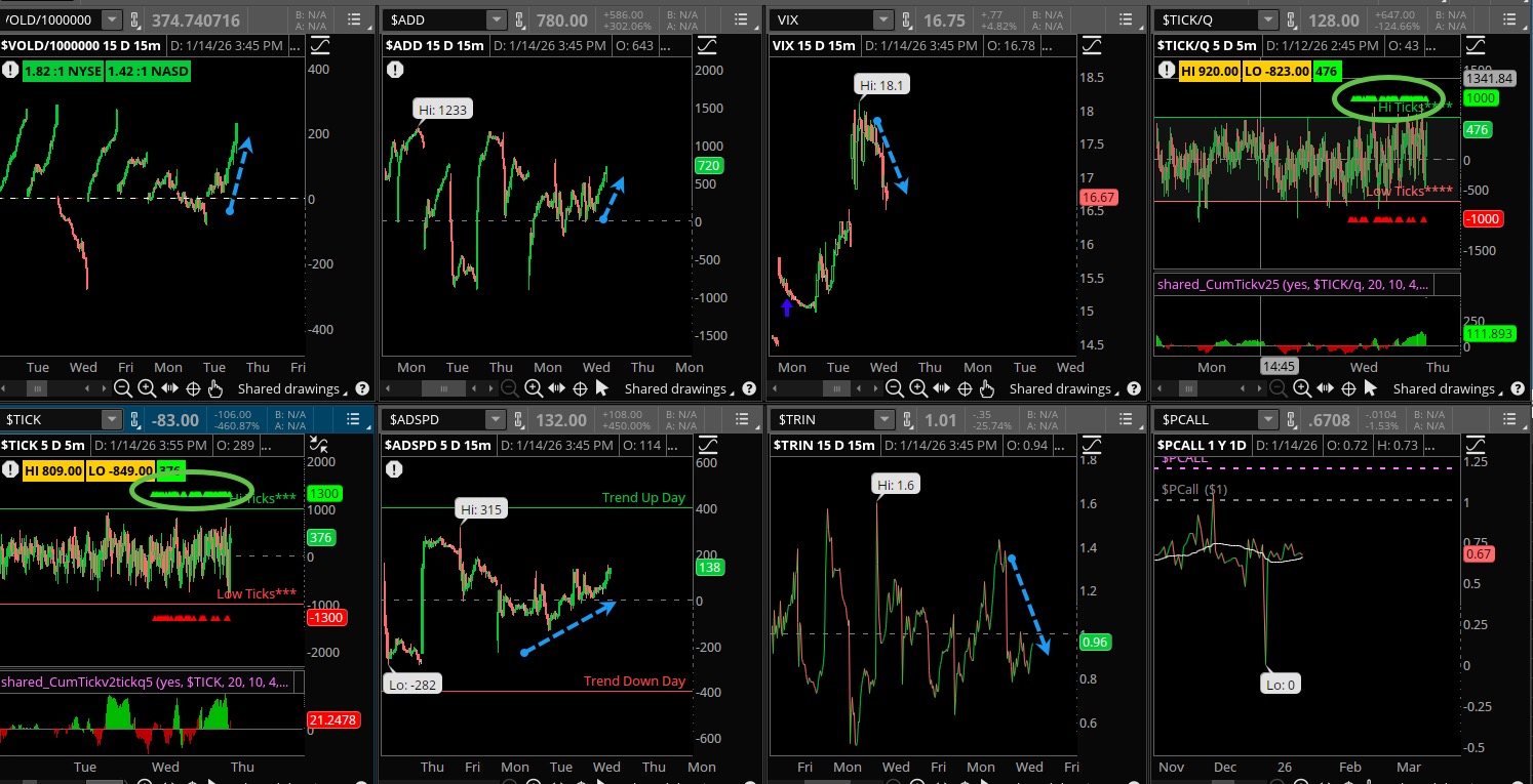 Solid internals, but mostly attributed to the success of the small caps Wednesday. TICKS were strong the entire day, heavy buy programs all day long but futures could not muster any sort of rally attempt. VIX spiked early on but fell on its sword throughout the day, that bodes well if the markets rally into the end of the week. VOLD was very strong and ADD even finished on its highs of the day. We’ll call this a positive divergence, but prefer to have price joining the internals in the bullish party.