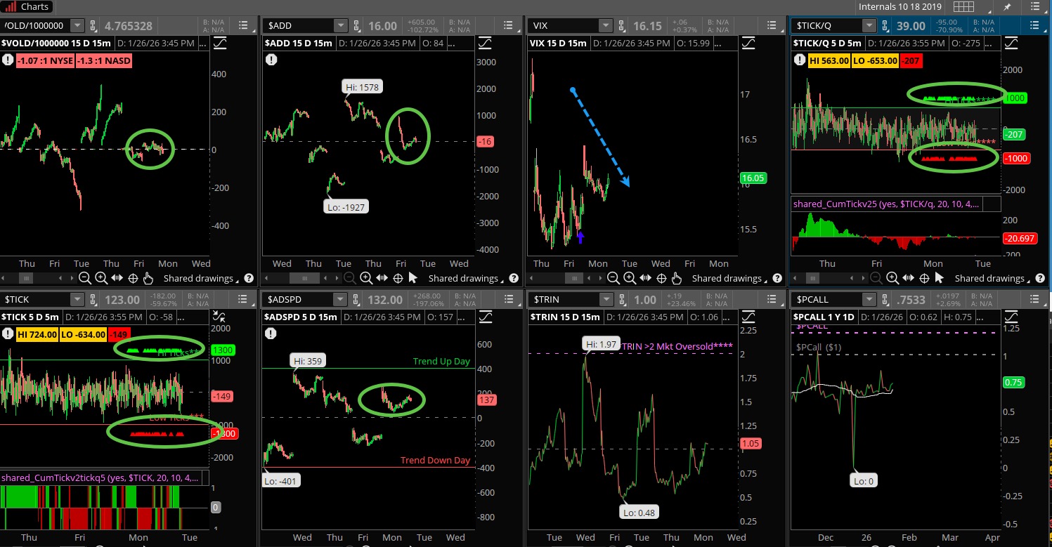 Not much changed from Friday, with the VOLD still trapped and the ADD falling from the highs. VIX was mostly muted on the day but did finish slightly higher, the TICKS again were spread evenly. A down session for the small caps kept the market in check, put/calls remain steady while TRIN edged up, that could be a sign of exhausted buyers.