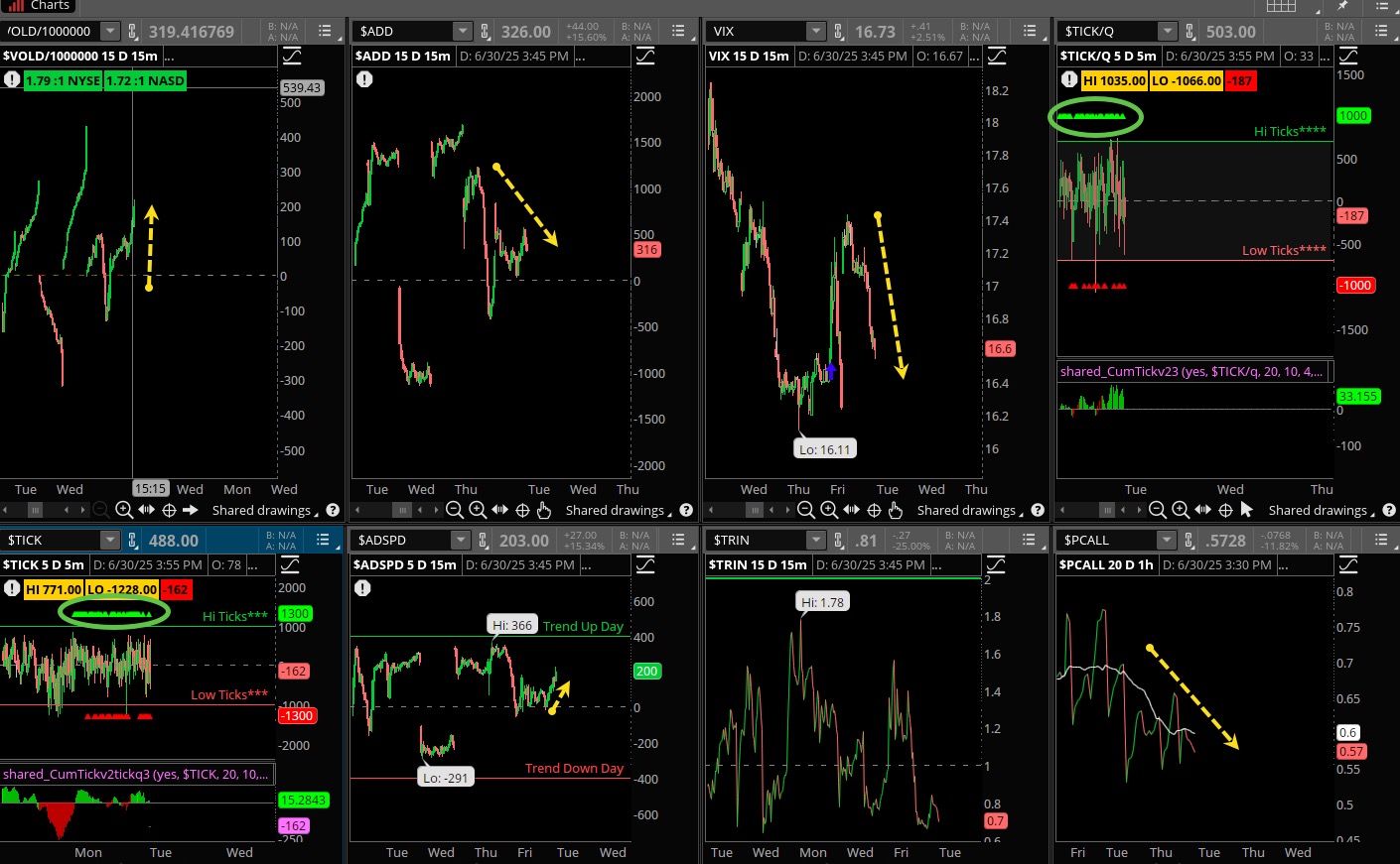 Heavy volume print end of day as one would expect with end of month/quarter. Big volume spurred on by options expiration, which may help give us a read on the rest of the month. July 1st (today) is often a very positive day in the markets, we’ll see if history is our guide. Given the chance of lower turnover this week and low volatility I’m not going to hold my breadth.