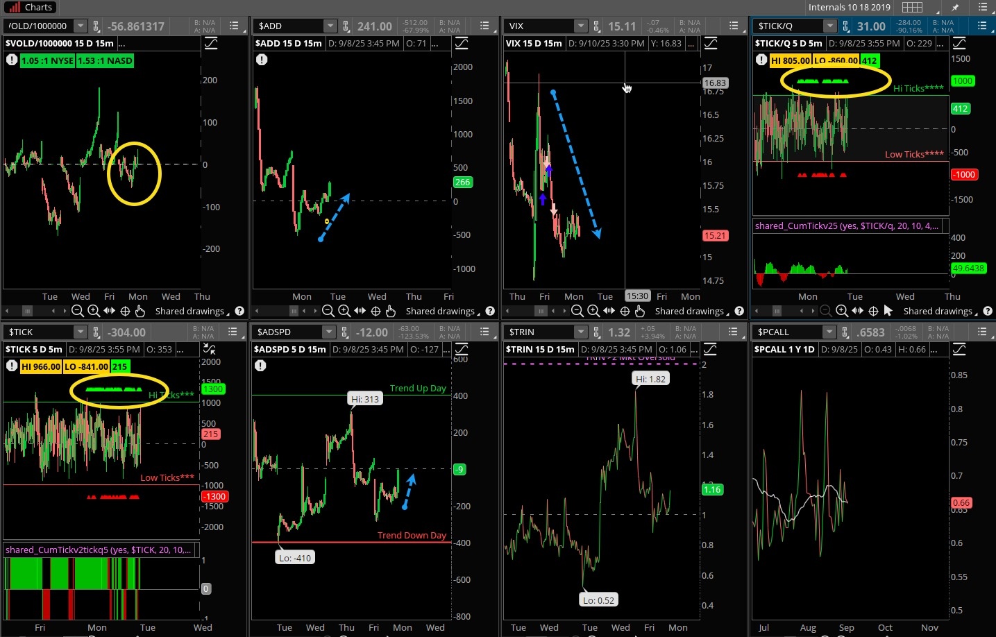 I’m going to say modest improvement in those internals. The VOLD and ADD were not screaming out loud, and the ADSPD was decent but only finished at the zero line. Ticks were evenly distributed, VIX fell sharply again and is still hovering near 15%, put/calls remained contained. We look for better action from the internals later in the week.