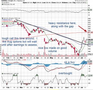 With Google it seems past is prologue. I look for similar stock patterns as the past, excessive readings on technicals and option pricing. Ironically, the stock pattern on the daily chart is very similar to the one seen in July 2009, where the stock rallied strong, the bollinger bands widened but the stock stalled after earnings. We could see the same reaction. I’m going to sit this one out but will look to add something if the stock exceeds 560 or so. The options that expire tomorrow are priced in heavily. So, would it be right to sell options? Not quite the best way to go because the bollingers are both widening and are opening at extremes, the hourly chart is stagnant. The move to sell options this time around is opening the door to trouble. How about August? I like this month but will wait until after the earnings hit to make my play. (chart below)