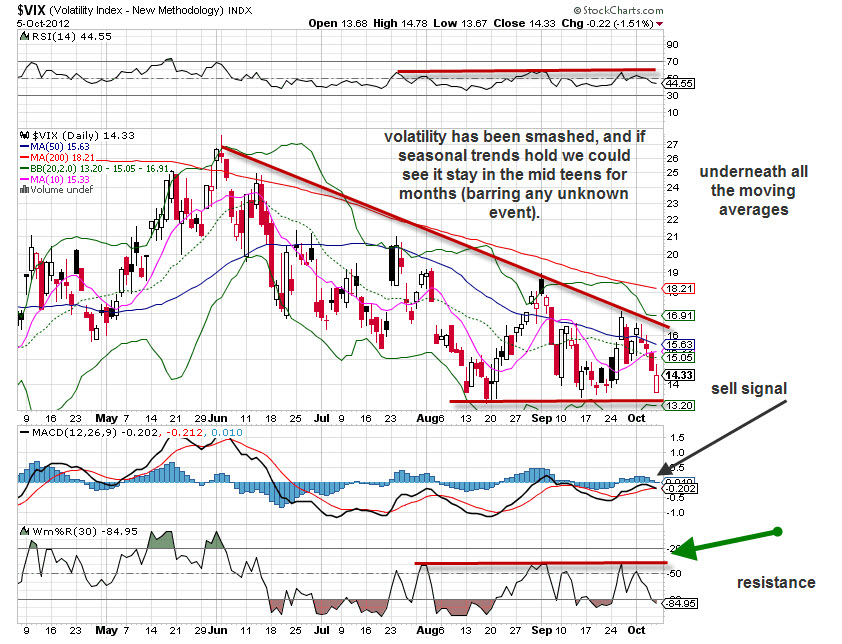 Volatility is considered a trader’s friend, yet the trend has been pointed down for months. What’s a trader to do? Does this mean all is fine in the world, nary a worry? Hardly so, but the short term unknowns have been revealed and the market is saying ‘rock on’. All we need to see is the chart to make that determination (see below).